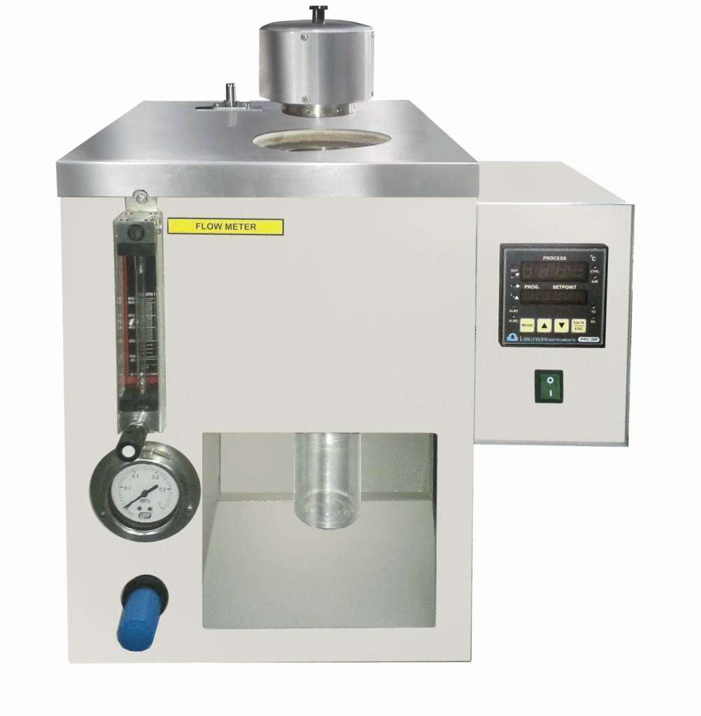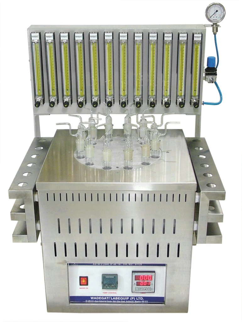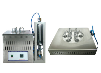 Impinger method.Electronic digital temperature control.Pressure gauge with needle valve.Fixtures for test vessel.Pre-heating oven of 20 litre capacity.Circulation bath with external circulation device.